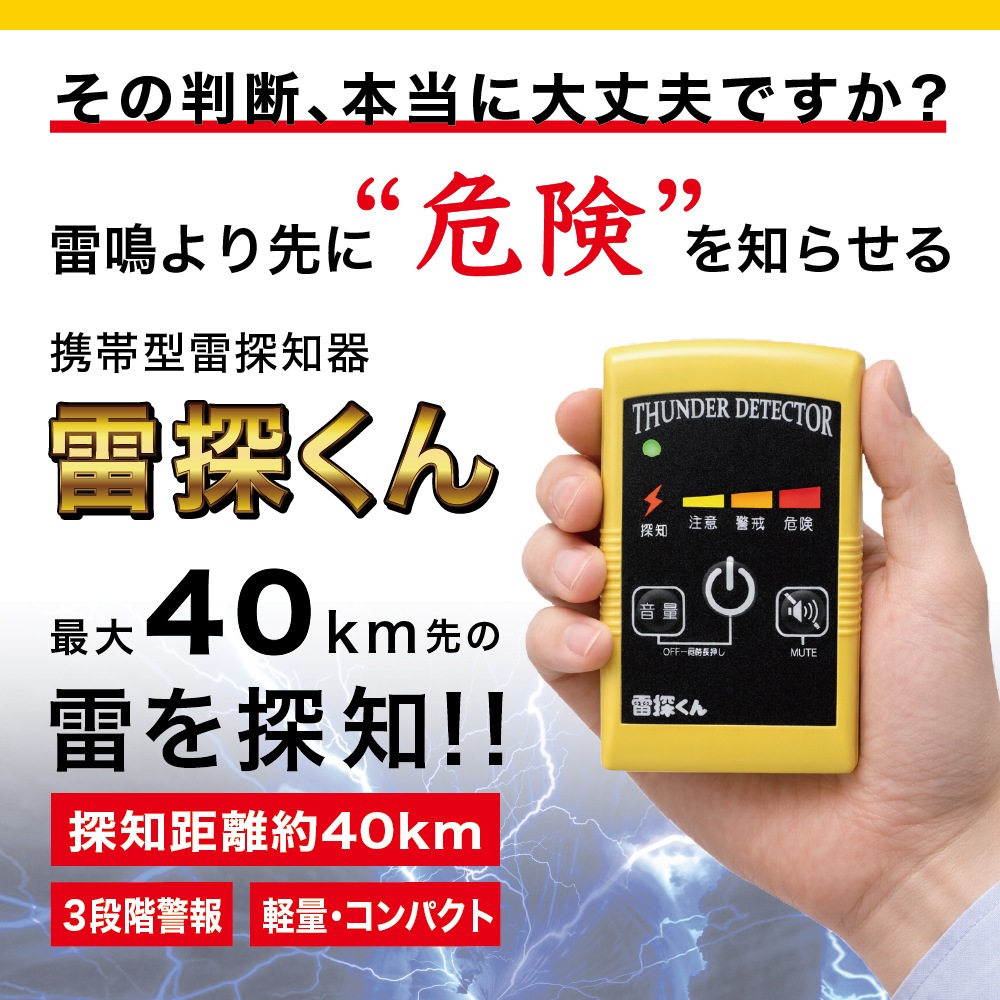 雷探くんは、約40km先の雷放電を検知し、強さや距離に応じて3段階で警報を発する携帯型雷探知器です。名刺サイズの生活防水設計で、雷害対策のプロフェッショナル集団として半世紀以上の実績を持つ国内メーカーの日辰電機製作所が開発・製造しています。