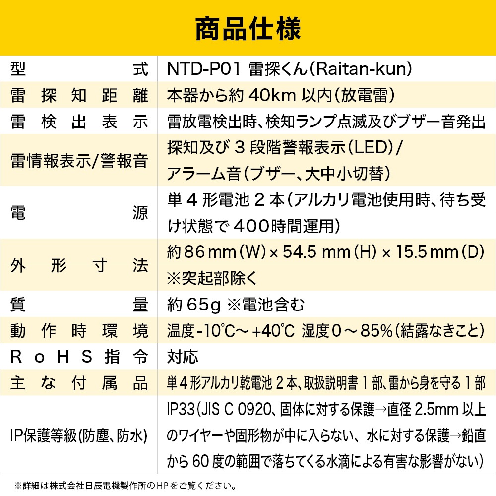 ・主な付属品:単4形アルカリ乾電池 2本、取扱説明書 1部、雷から身を守る 1部