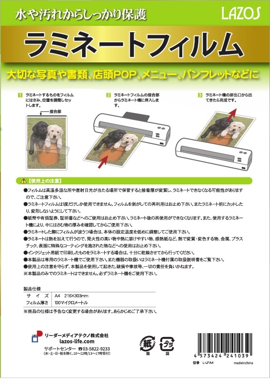 L-LFA4 ラミネートフィルム A4サイズ・100枚入【宅配便発送・1梱包6個まで】