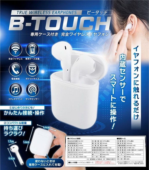 製品仕様 ワイヤレス仕様:V5.0 周波数範囲:2.4GHz 送信出力:Class2 通信距離:約10m 対応プロファイル:HSP、HFP、A2DP、AVRCP 充電可能回数:約300回 充電時間:約1時間 連続使用時間:約2〜2.5時間 充電可能回数:約300回 充電時間:約1時間 使用電源:USB充電 入力電圧:DC5V/1A