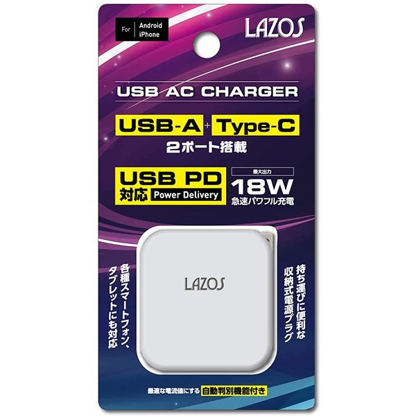 Type-C + USB-A の2ポート搭載で2台同時充電可能のAC充電器です。