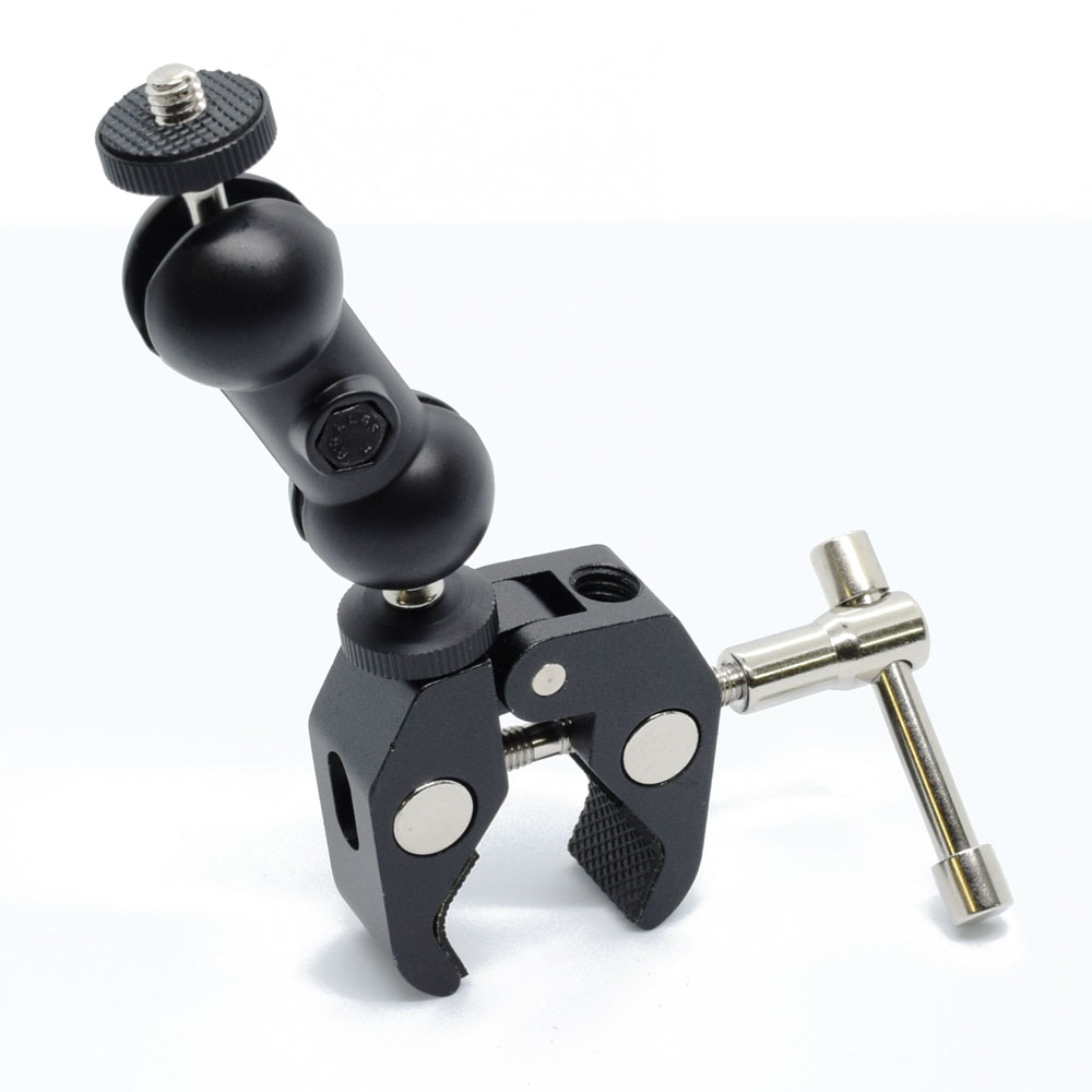 【特徴】 ■クランプ式のカメラマウント。 ■アーム部分はボールジョイントを2つ搭載し、角度調節が自由自在にできます。 ■棚板やテーブルの脚などにカメラを固定できる優れもの。 ■カメラの他、市販のスマホホルダーを利用してスマートフォンの固定にもご活用いただけます。 ※スマホフォルダーは付属しておりません。別途ご用意ください。