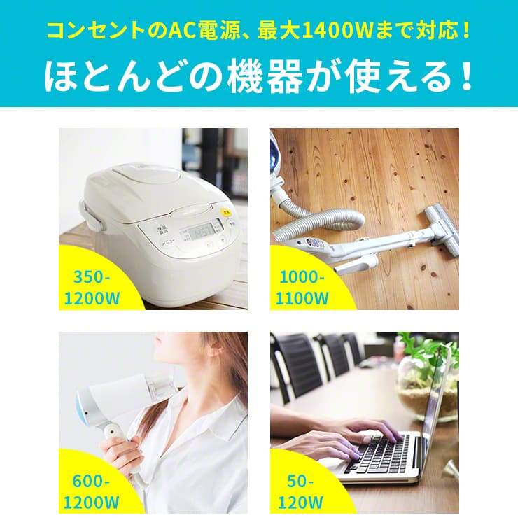 ・AC電源は合計1400Wで消費電力の高いドライヤーなどの家電にも対応