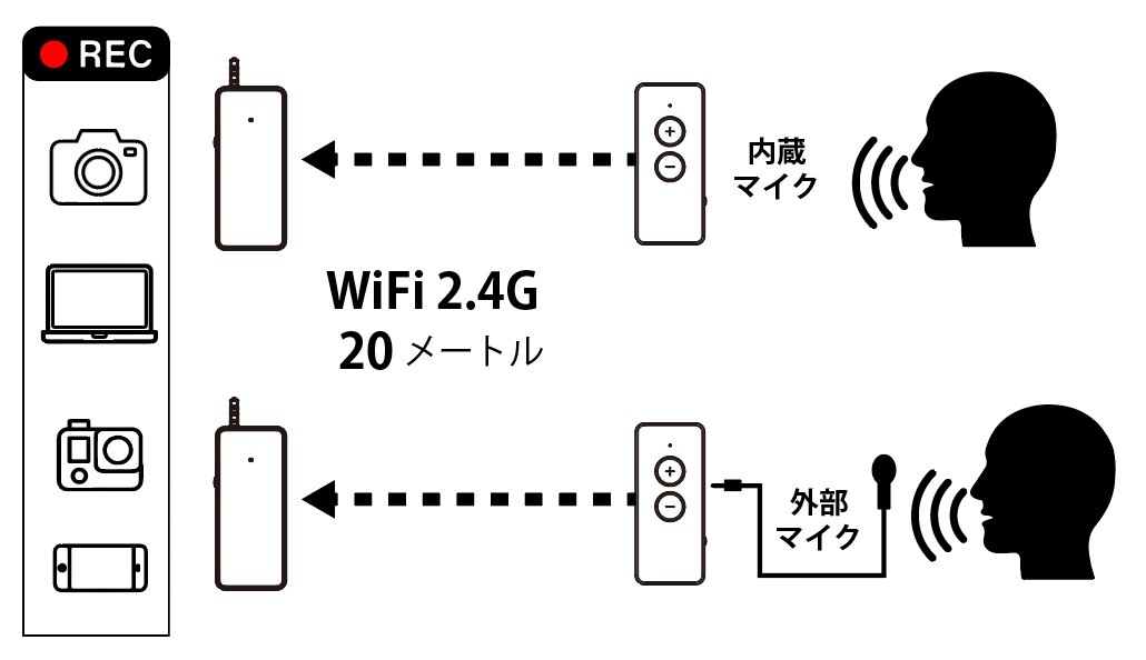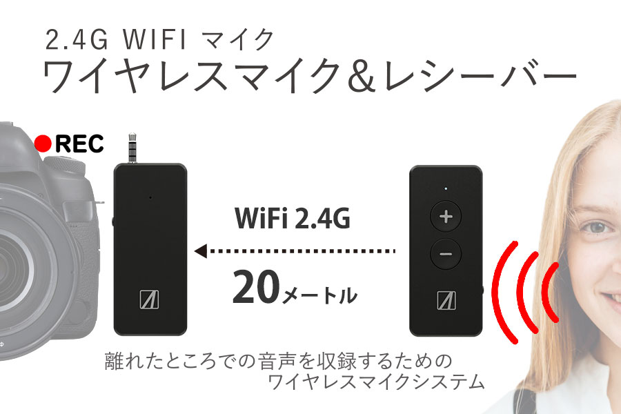 本製品はワイヤレスで音声を信号変換しビデオカメラやスマートフォンで音声を録音する事が可能です。距離が遠く音声が収録できない、ケーブルはかさばるなどの悩みを解決いたします。