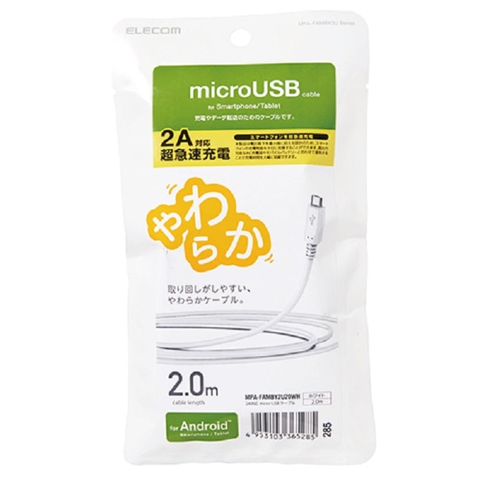ケーブルがやわらかくとり回しがしやすい、やわらかケーブルを採用!高出力可能なAC充電器やモバイルバッテリーと合わせて使用することで、スマートフォンの超急速充電ができるmicroUSBケーブル。