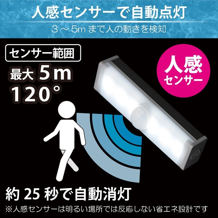 本製品を暗い場所に設置することで、人感センサーが人の動きに反応して、LEDライトを自動的に点灯し、反応がなくなると約25秒で自動的に消灯します。