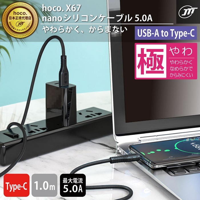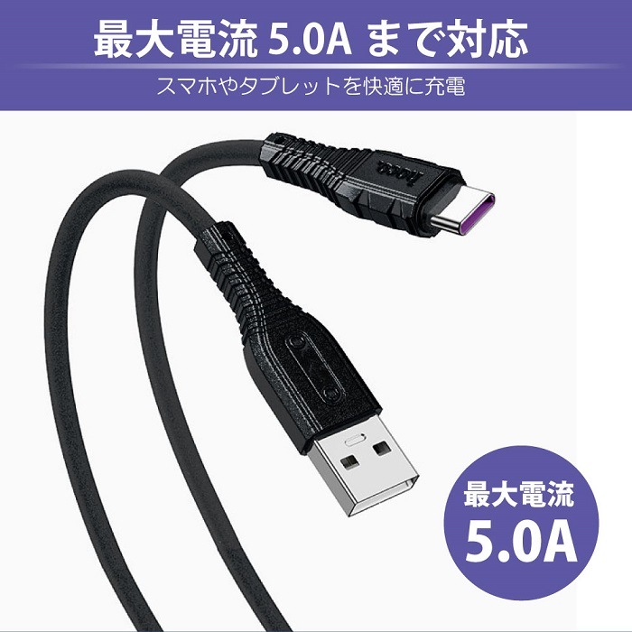 USB-A to Type-Cケーブルは、最大5.0Aまでの充電に対応しており、スマホやタブレットを快適に充電することができます。