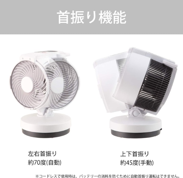 コードレスで風量1の場合約20時間運転、風量5の場合約3時間運転できます。(使用状態や周囲の温度などにより多少異なります)