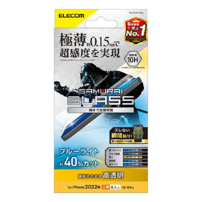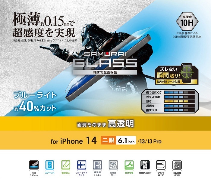 ・極薄0.15mmで超感度を実現。SCHOTT社製ガラスを採用したブルーライトカットタイプのiPhone 14、iPhone 13、iPhone 13 Pro用液晶保護ガラスです。