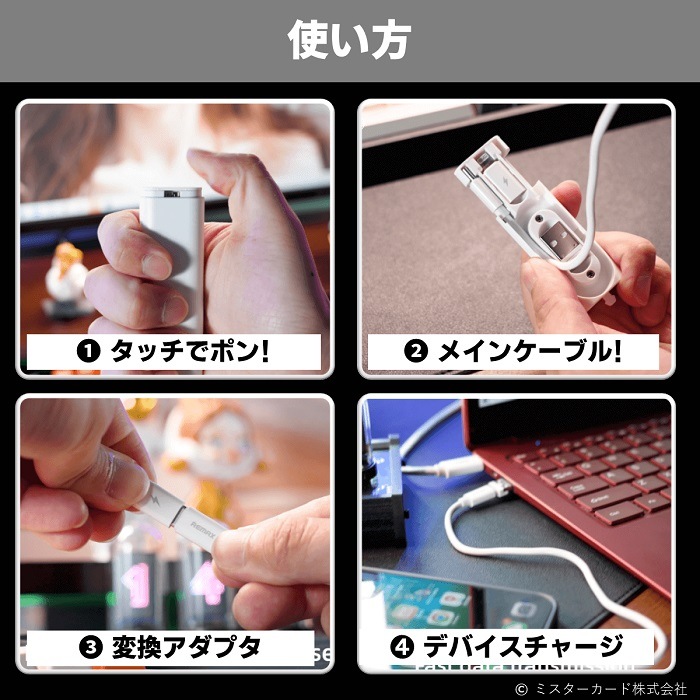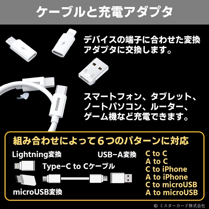 ※本製品のケーブル及び付属の変換アダプタは本製品での組み合わせの使用を想定しております。他社ケーブルや他変換アダプタとの組み合わせでは故障・破損・発火の原因となりますので絶対にお止めください。