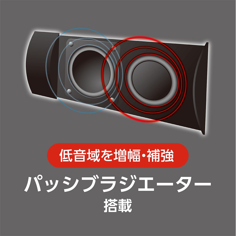 パッシブラジエーター搭載で低音域を増幅・強調して出力します。
