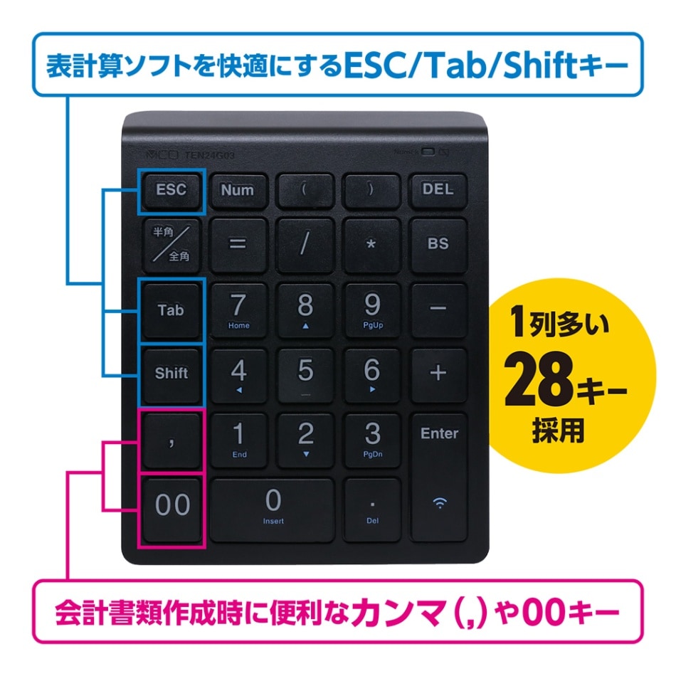 *1列多い28キー採用の表計算ソフトで使いやすいテンキー*