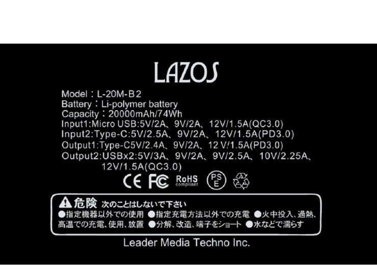 入力 1:Micro USB:(QC3.0) 5V/2A、9V/2A、12V/1.5A