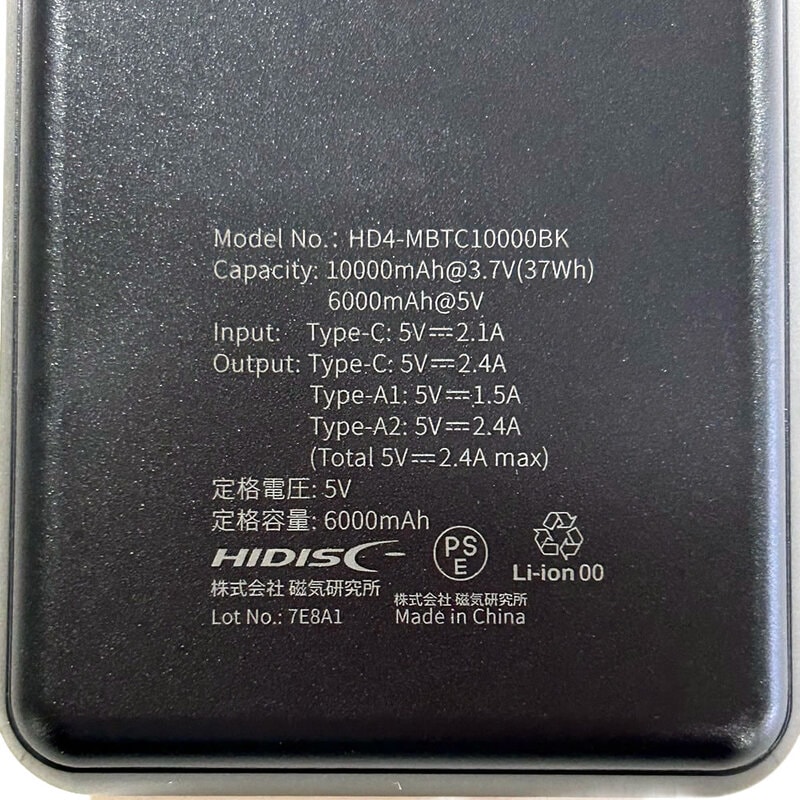 容量・定格容量 3.7V:10000mAh/5V:6000mAh