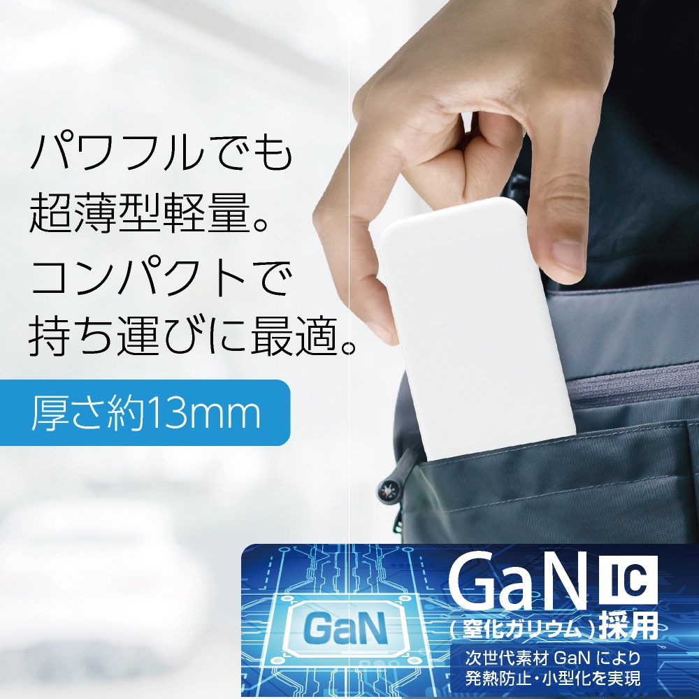 次世代半導体GaN(窒化ガリウム)を採用した超薄型(約13mm)サイズなので持ち運びにも最適。最大出力20WのパワフルなAC充電器
