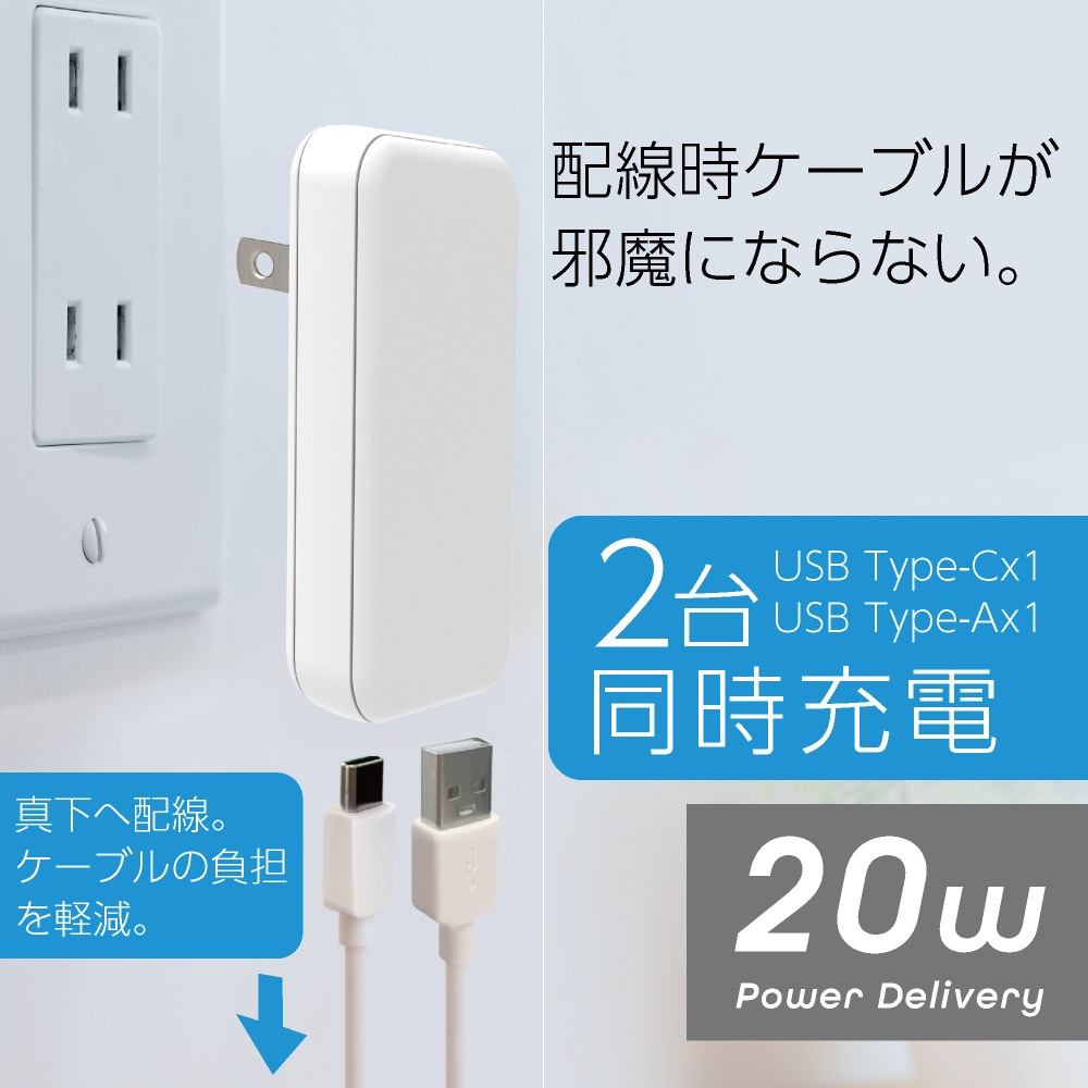 配線すっきり!次世代半導体GaN(窒化ガリウム)を採用した超薄型(約13mm)サイズなので持ち運びにも最適。Type-Cポートx1、Type-Ax1の合計2ポートと搭載し、USB Power Delivery最大出力20Wのパワフルな平型AC充電器です。