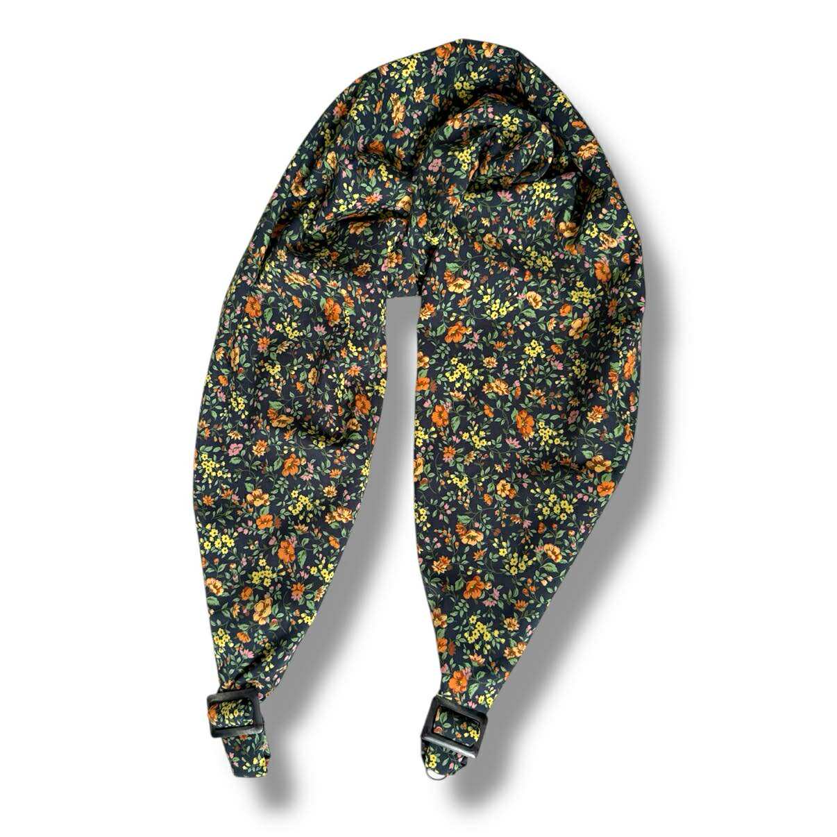 幅広のスカーフ生地が重さを分散し、肩や首への負担を軽減。